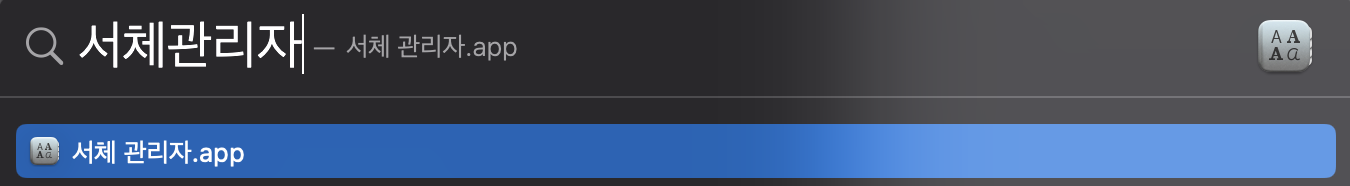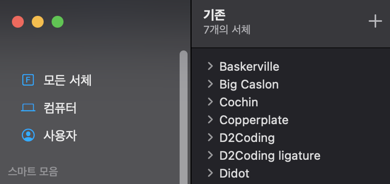 맥의 서체 관리자를 실행하여 d2codingfont를 추가해 줍니다.
