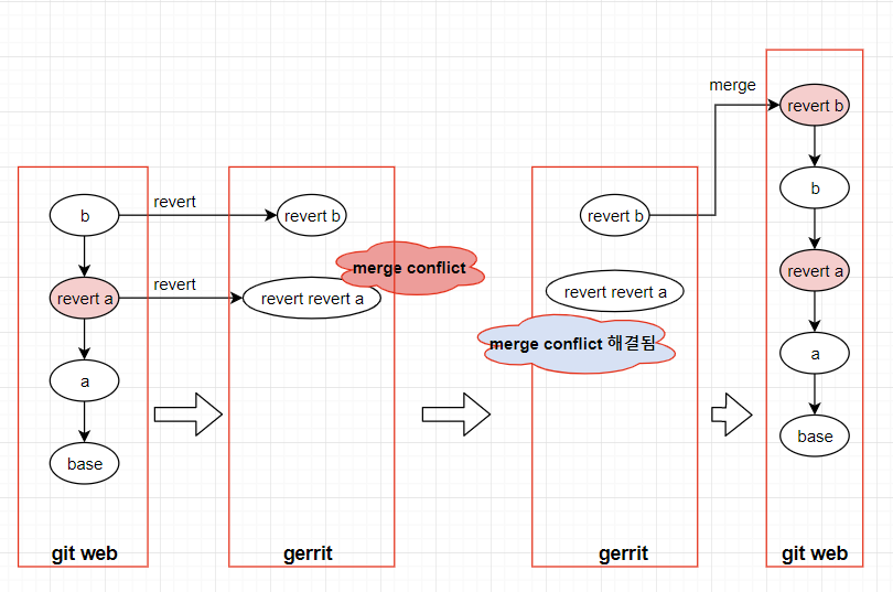 gerrit에서 b 을 revert 하고 revert a 을 revert하면 revert revert a는 merge confilict가 발생. 원인 : revert a 가 revert되기 위해서는 git web상에서 revert a 상태의 base여야 하는데 추가로 수정된 commit b가 base 상태이기 때문에 revert a 는 revert 불가. 해결 : b를 revert하고 git web의 적용하여 revert a로 base를 맞춰주면 revert a의 base 상태이기 때문에 revert a를 revert 할 수 있는 상태가 되어 merge conflict이 해결된다. diagram 원본 파일 : diagram tool : https://www.draw.io/ Flowchart Maker &..
